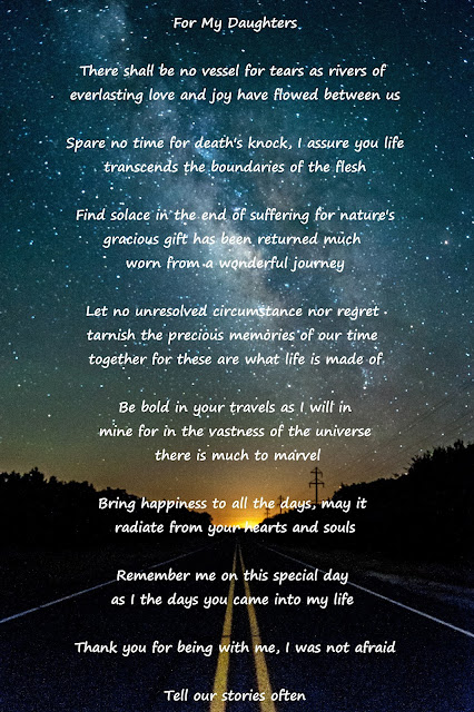 Within just hours of Mom's passing, my brother-in-law, Don, had the most special gift for my sister and me...a poem that he wrote, superimposed on a beautiful picture that he had taken. Don may have written the poem, but it is as if my mother had spoken through him. I have read this poem countless times, and it brings me comfort each and every time that I read it. I count it among my treasures, and now I would like to share it with the rest of the world: